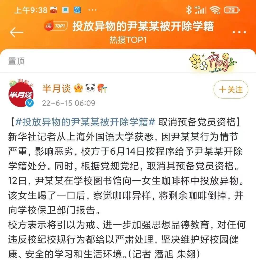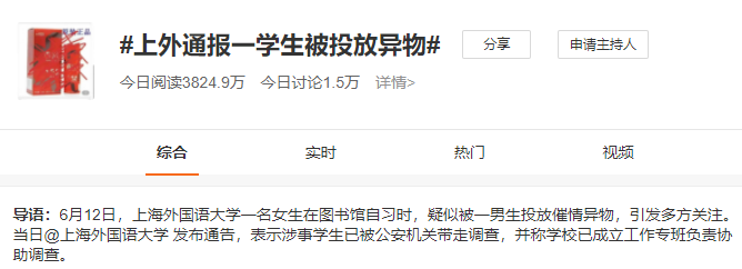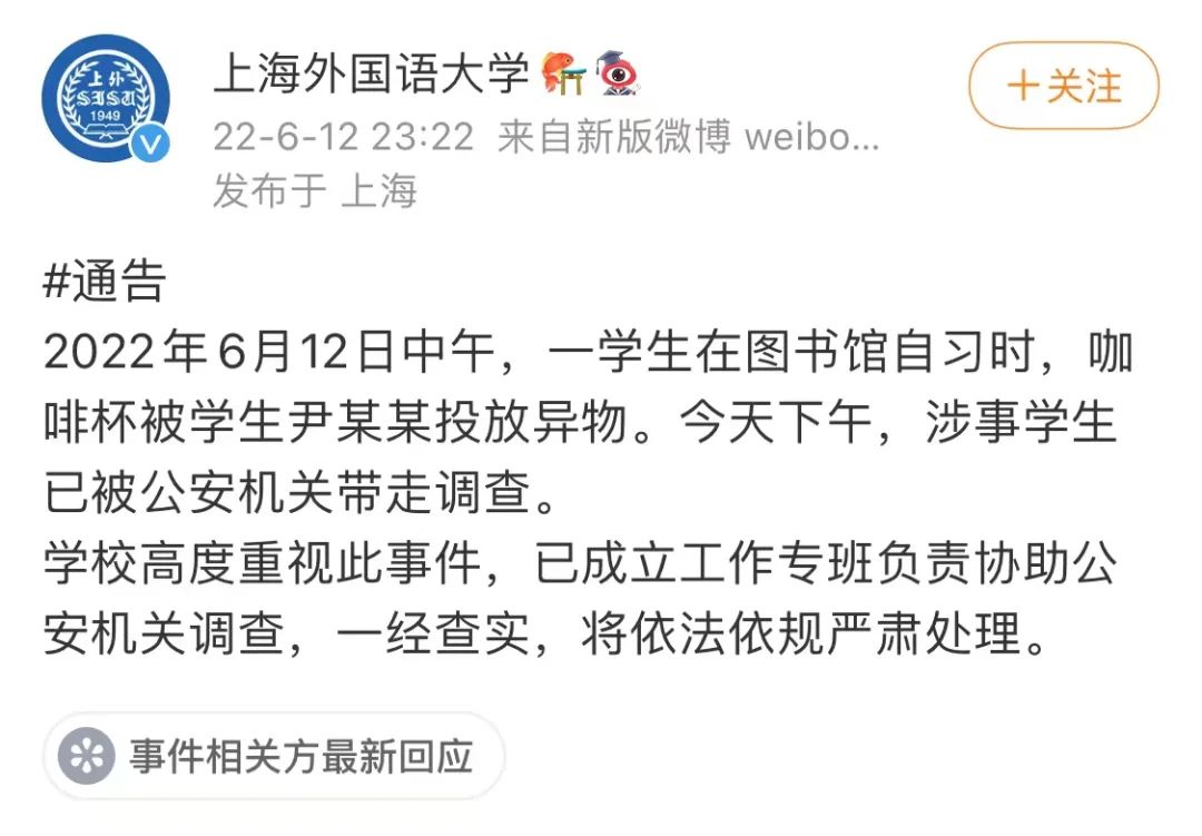 6月12日,一则“上海外国语大学一女生咖啡杯中被同校男同学投放不明物一事”,冲上热搜。
