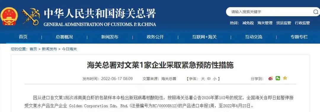 因从进口自文莱1批次冻南美白虾的包装样本中检出新冠病毒核酸阳性,按照海关总署公告2020年第103号的规定,全国海关自即日起暂停接受文莱水产品生产企业 Golden Corporation Sdn. Bhd.(注册编号为RC/00008612)的产品进口申报1周,至2022年6月23日。