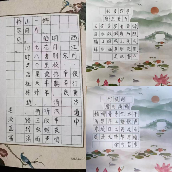 夏至,在诗人心中有着重要的地位,也留下了很多优美的古诗词。五年级同学选择自己喜欢的夏至古诗词,用硬笔书法作品呈现出来, 夏至日感受传统文化,抄写古人笔下的夏至,用笔书写,用心感悟。并配上夏至时节的图画,通过对农谚的搜集、了解、配图,形象感受夏至节气的特点。
