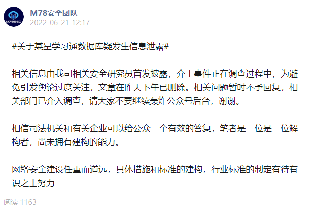 目前该公众号已经将该文章删除,并且发布了一条消息称,关于某星学习通数据库疑发生信息泄露相关信息由我司相关安全研究员首发披露,介于事件正在调查过程中,为避免引发舆论过度关注,文章在昨天下午已删除。相关问题暂时不予回复,相关部门已介入调查。