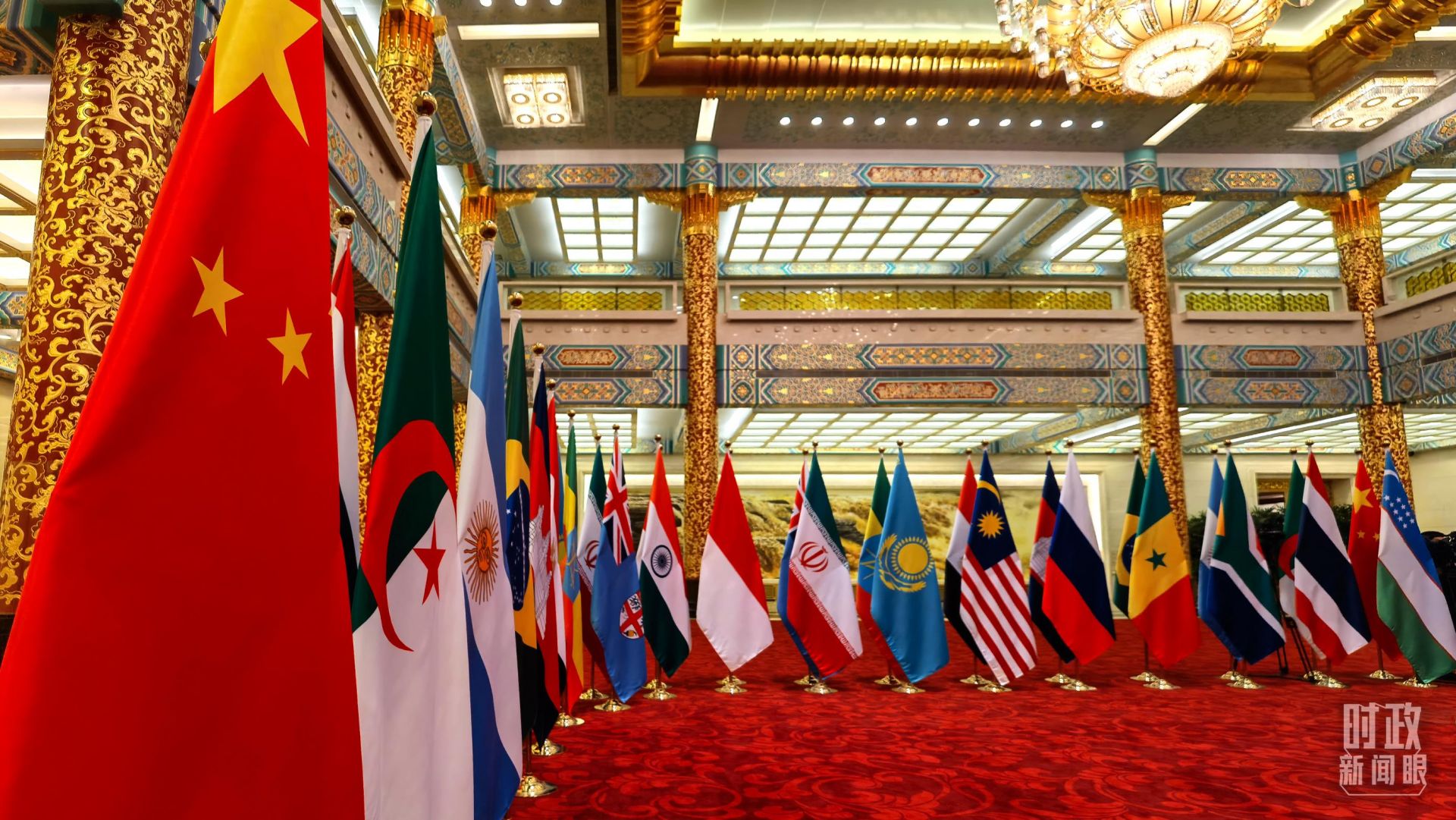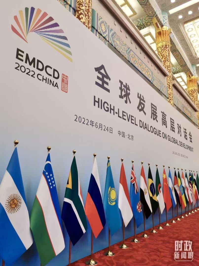全球发展高层对话会的中方会场,设在人民大会堂金色大厅。林立的参会国旗帜、红色的地毯,映衬着会议的热度。