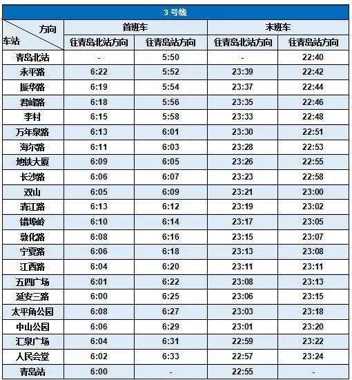 3号线青岛站首班车时间提前15分钟至6:00,青岛北站首班车时间提前10分钟至5:50。