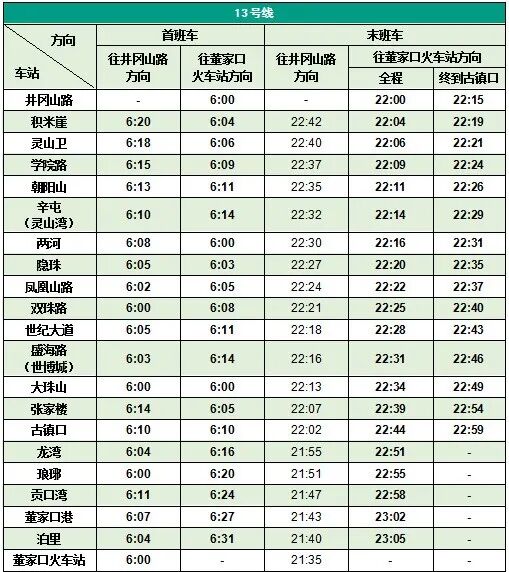13号线井冈山路、董家口火车站首班车时间均提前15分钟至6:00。