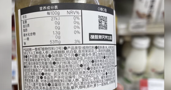 除水和人参外,“一整根”熬夜水配料表包含的杭白菊、茉莉花,都是常见的药食同源材料,而三氯蔗糖、赤藓糖醇则为市场上常见的代糖产品,食材价格也颇为透明。如此看来,一瓶植物饮料的实际成本远远低于售价。