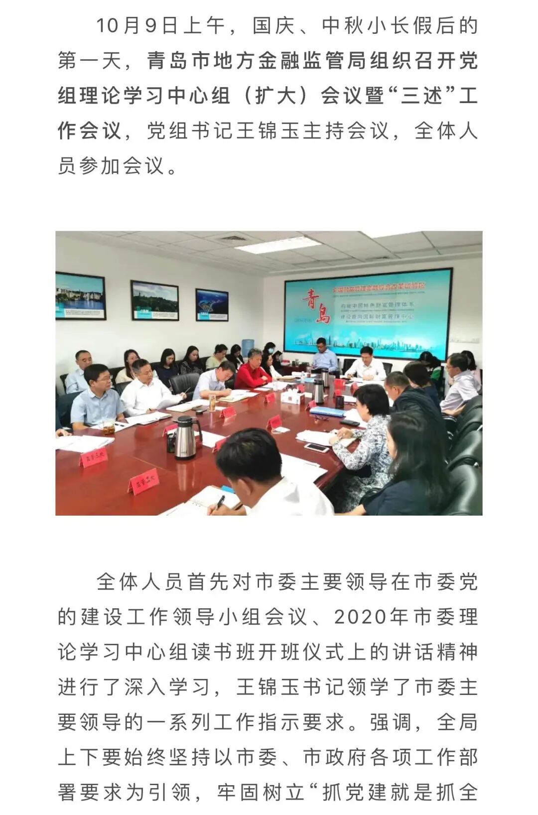 告别青岛市财富管理金融综合改革试验区的核心区和主阵地金家岭金融区,10月9日上午,王锦玉以青岛市地方金融监管局党组书记的身份主持青岛市地方金融监管局党组理论学习中心组(扩大)会议暨“三述”工作会议。