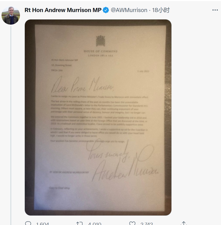 7月5日,驻摩洛哥贸易特使安德鲁·穆利森辞职,他在辞职信中表示,约翰逊的执政地位已经“不可挽回”。