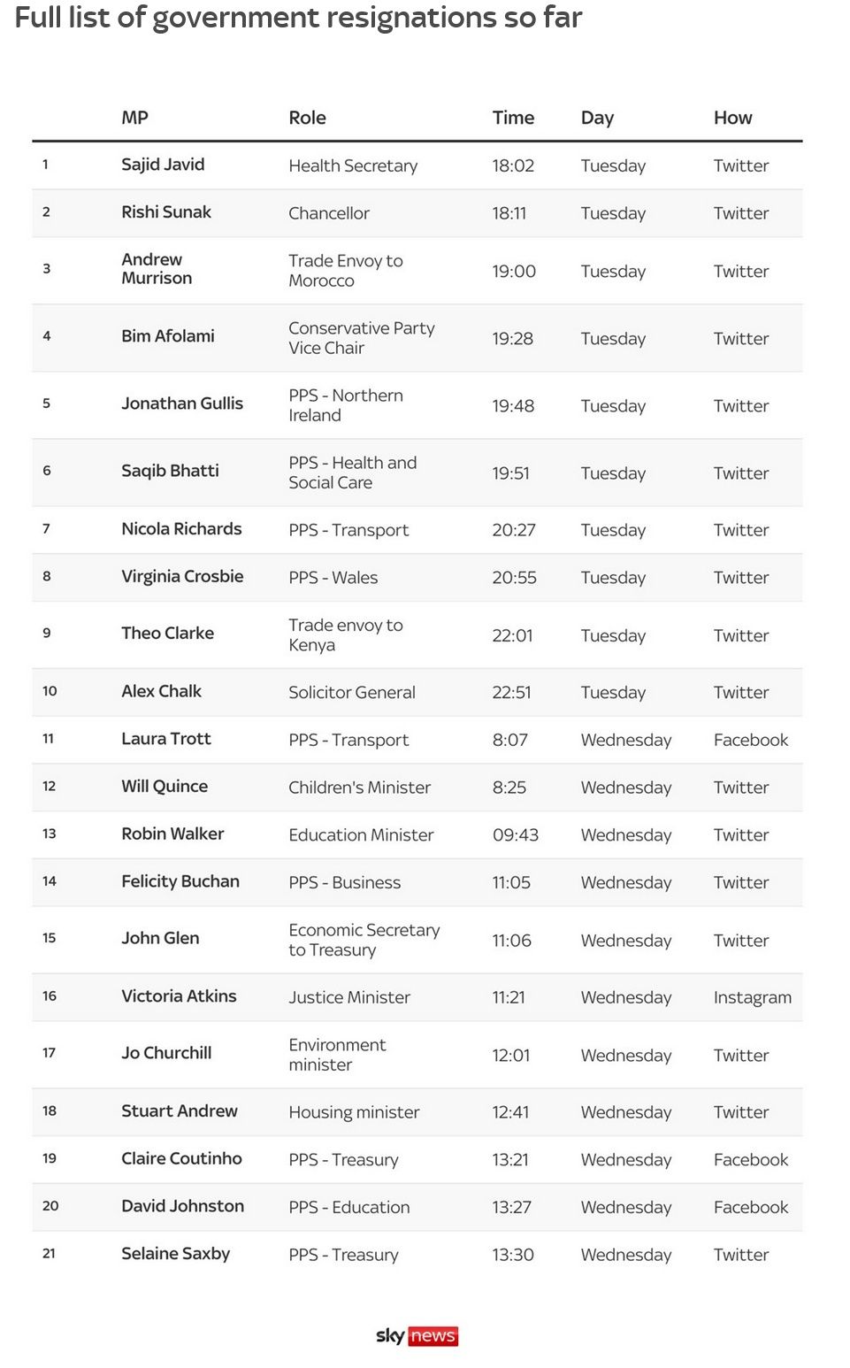 以下为7月5日到截至目前,从约翰逊政府辞职的政府大臣或官员: