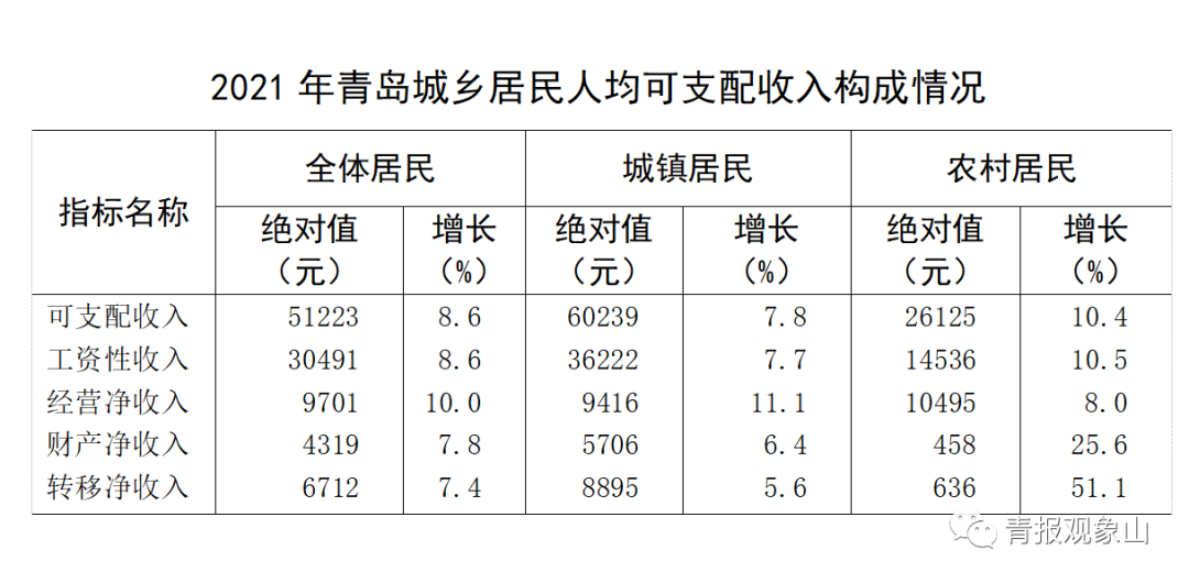 《2021年青岛市国民经济和社会发展统计公报》显示,2021年,青岛市全体居民可支配收入为51223元,工资性收入30491元,占比为59.5%。其中,城镇居民可支配收入为60239元,工资性收入为36222元,占比为60.1%;农村居民可支配收入为26125元,工资性收入为14536元,占比为55.6%。