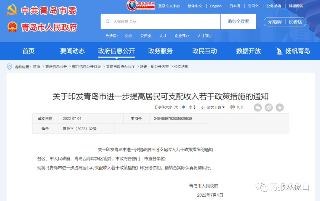 近日,青岛市政府印发《青岛市进一步提高居民可支配收入若干政策措施》,从“稳步提高居民工资性收入水平”“大力促进农民增收”“稳步提高居民财产性收入”“持续完善社会保障体系”四个方面提出52条政策举措,进一步提高居民可支配收入。