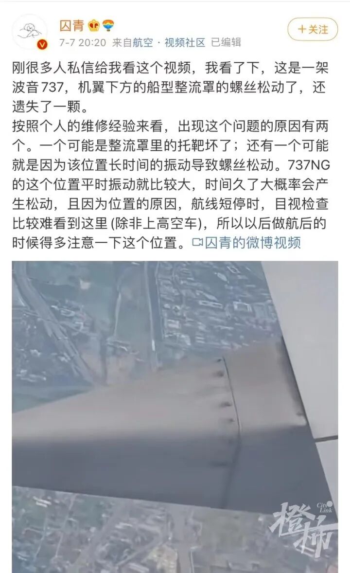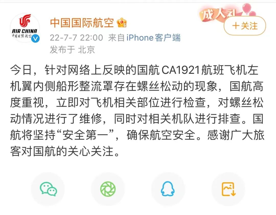 7月7日深夜,中国国际航空通过官方微博回应网络反映的国航CA1921航班飞机左机翼内侧船形整流罩存在螺丝松动的现象。