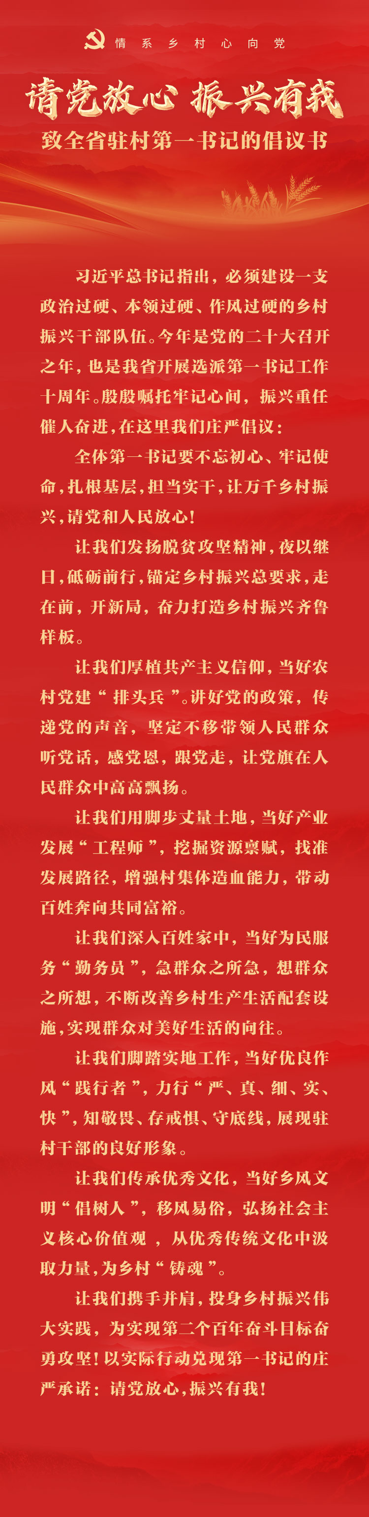 7月8日,“情系乡村心向党——山东驻村第一书记寄语党的二十大”网络主题活动在济南启动。启动仪式上,来自省、市、县三级选派的第五批驻村第一书记代表翟大恒、宋涛、谢艳红现场宣读了主题为致全省驻村第一书记的倡议书《请党放心 振兴有我》。