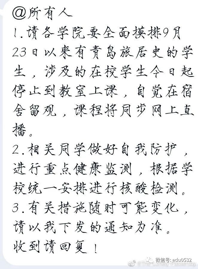 而对在外求学的青岛籍学子来说,十一返青再回校后,昨天和今天也陆续收到了学院的通知。以济南高校为例,要求摸排有青岛旅居史的学生,即日起停止上课,宿舍留观。