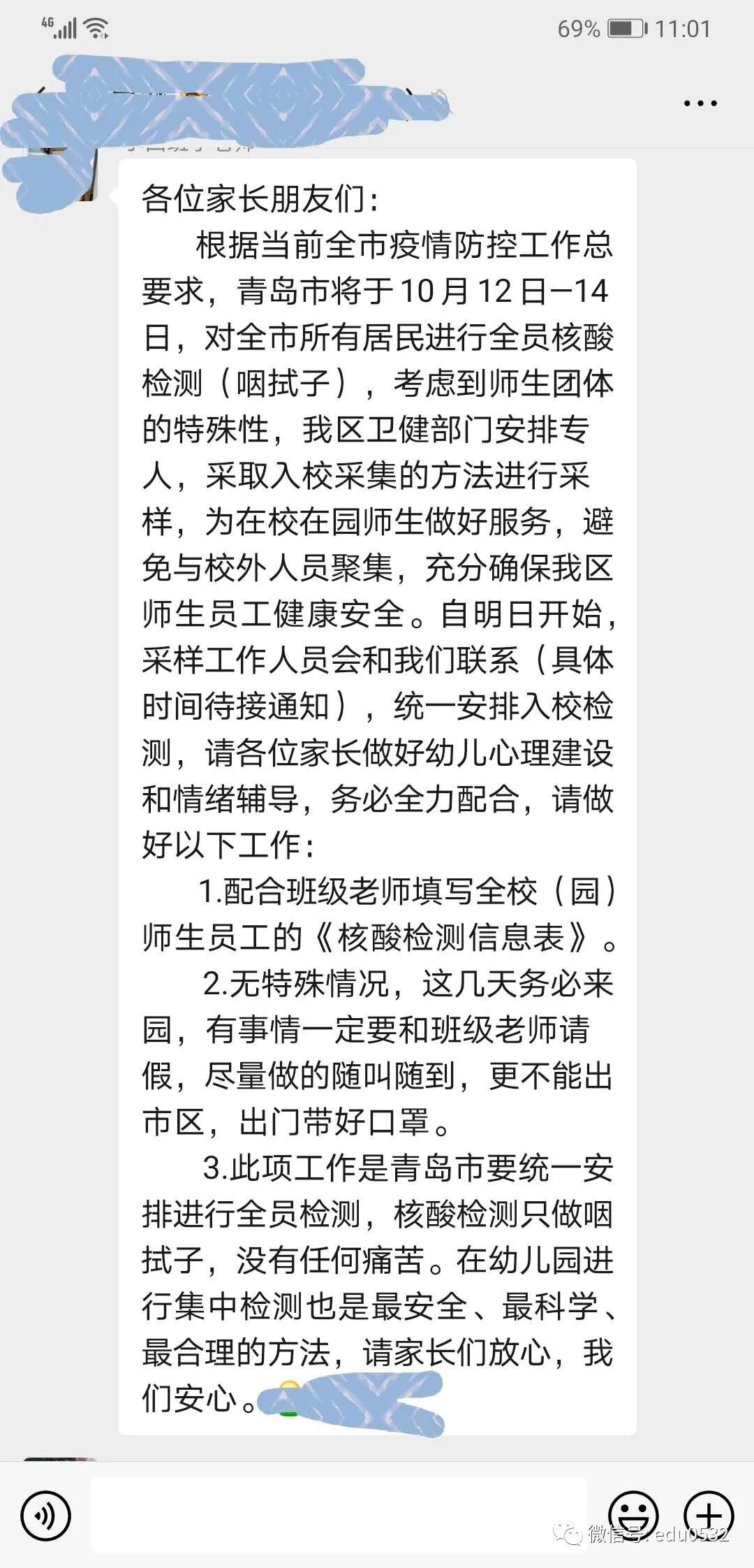记者也从各方获悉,受此影响,岛城部分学校取消了学农、运动会等聚集性活动。同时从昨晚开始,各幼儿园、中小学开始陆续向家长发放紧急通知,要求在园幼儿、学生在园内、校内完成核酸检测。到现在为止,青岛实验初中、青岛第二实验初中、青岛安永路小学等学校,已经开始了核酸检测。