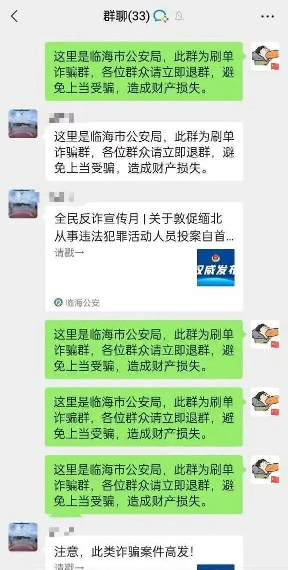 气急败坏的诈骗分子看到后,连发数个表情包刷屏,企图淹没民警们在群里发布的反诈信息。可是民警们又怎会让他们得逞呢?此时群内蛰伏的数十个民警集体发声“这里是临海市公安局,此群为刷单诈骗群,各位群众请立即退群,避免上当受骗,造成财产损失”。