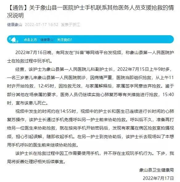 通报称,该护士为象山县第一人民医院儿科副护士长。2022年7月15日上午9时多,一名三岁患儿来象山县第一人民医院就诊,因病情严重,医院当即组织抢救,从上午11时许开始抢救,12时45分,因抢救无效,与家属解释后,家属签字同意放弃抢救。鉴于部分其他在场亲属的要求,医务人员仍继续实施心肺复苏等有关措施进行抢救,15时40分,宣布该患儿死亡。