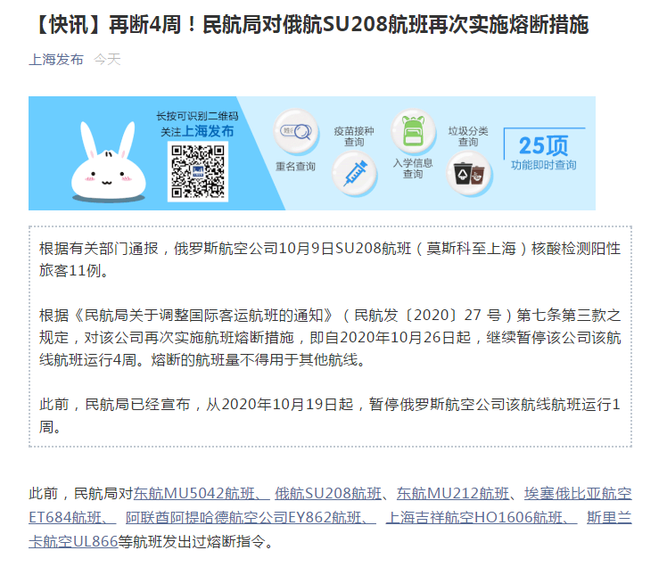 此前,民航局已经宣布,从2020年10月19日起,暂停俄罗斯航空公司该航线航班运行1周。