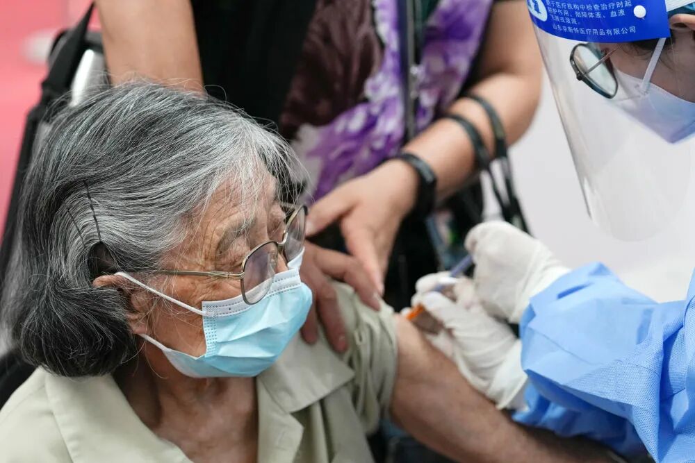 7月13日,在北京市朝阳区奥运村街道一处新冠疫苗接种点,医护人员为89岁的平女士接种新冠疫苗加强针。新华社记者 鞠焕宗 摄