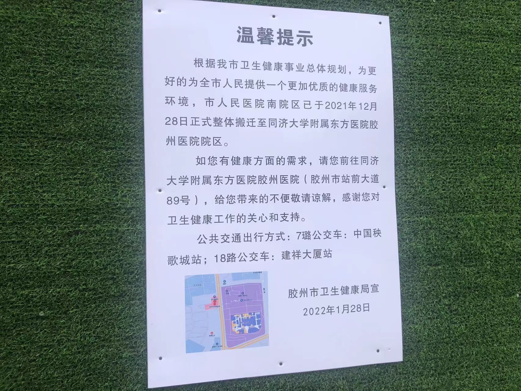 近日,记者前往胶州市湖州路180号探访时看到,原胶州市人民医院门诊楼周围设置围挡,内部正在实施改造。记者从现场张贴的公告获悉,该处原为胶州市人民医院南院区。2021年12月28日,胶州市人民医院整体迁移到胶州市站前大道89号的同济大学附属东方医院胶州医院,该院区停诊至今。