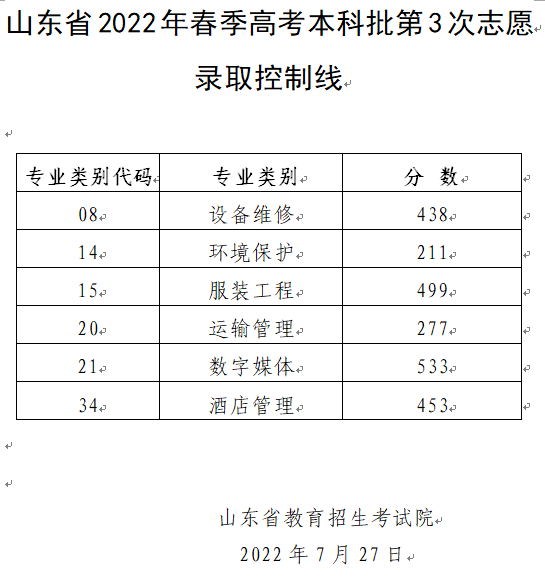 山东2022春季高考本科批第3次志愿录取结果7月29日公布