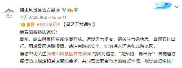 崂山风景区全线恢复开放,仰口、太清、巨峰索道正常营运 2022-07-28 14:53 青岛日报社/观海新闻 0 青岛日报社/观海新闻7月28日讯 观海新闻记者从崂山风景区官方微博获悉,目前,崂山风景区全线恢复开放。仰口索道、太清索道、巨峰索道正常营运。 责任编辑:郝媛媛