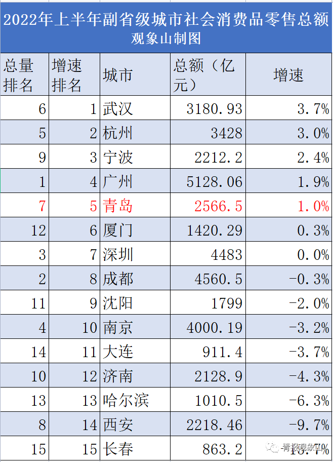 然而,就是在这一极其不利的情况下,青岛消费挺过来了,稳住了:上半年,全市社会消费品零售总额实现2566.5亿元,总量位居15个副省级城市第7位、24个万亿城市第13位;