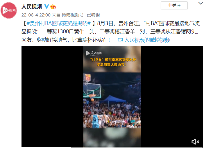 贵州台江这场篮球赛奖品接地气,网友:比奖杯实在 2022-08-05 21:38 人民视频 0 8月3日,贵州台江。“村BA”篮球赛最接地气奖品揭晓:一等奖1300斤黄牛一头,二等奖榕江香羊一对,三等奖从江香猪两头。网友:奖励好接地气,比拿奖杯还实在! 微博截图 责任编辑:岳文燕