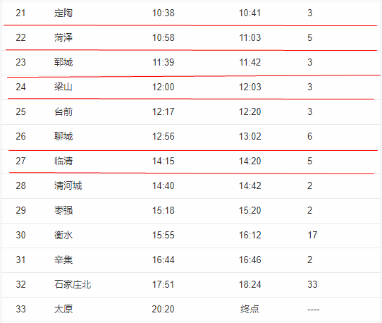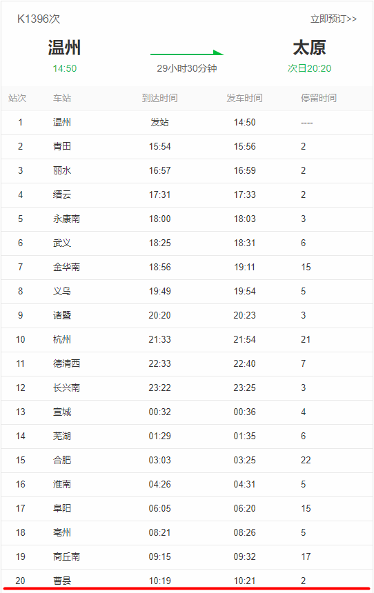 K1396次列车从温州出发,终点站太原,途经山东省内曹县、定陶、菏泽、郓城、梁山、聊城、临清7个车站。