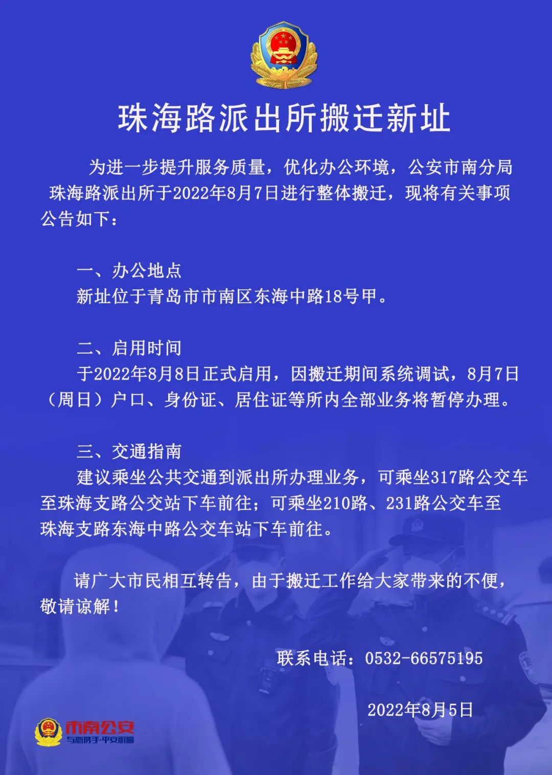 周知!珠海路派出所搬家啦,8月8日正式启用 2022-08-06 10:07 青岛日报/观海新闻 0 青岛日报社/观海新闻8月6日讯 为进一步提升服务质量,优化办公环境,市公安局市南分局珠海路派出所于2022年8月7日进行整体搬迁。新址位于市南区东海中路18号甲,于8月8日正式启用。(青岛日报/观海新闻记者 梁超) 责任编辑:李莎莎 (作者:梁超)