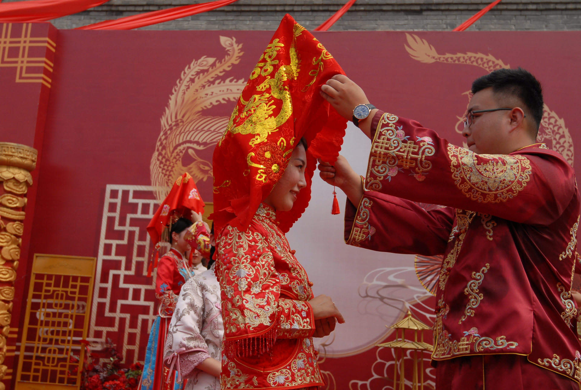 上午9时48分,伴随着喜庆欢快的音乐旋律,婚礼仪式正式开始。15对新人身穿中式婚服,在亲朋好友的祝福声中携手踏上爱的红毯。掀盖头、行三揖三让之礼、解缨结发、互赠信物、饮合卺酒、进行爱的分享、接受亲朋及社会各界的祝福……古典且有爱的传统婚礼仪式逐一上演,中华传统文化和新时代文明实践紧密相融。没有花炮轰鸣,没有豪华车队,没有奢华酒店……但现场仪式感满满的婚礼环节、新郎新娘的真情告白,吸引了广大市民纷纷驻足观看,赢得了阵阵掌声与欢呼声,已然构成了一道最为靓丽而独特的风景。