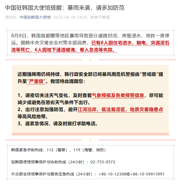 8月8日,韩国首都圈等地区暴雨导致部分道路封闭、房屋浸水、地铁一度停运。据韩中央灾难安全对策本部消息,已有8人因住宅进水、触电、突遇泥石流等死亡,6人因地下通道被淹、卷入急流等失踪。