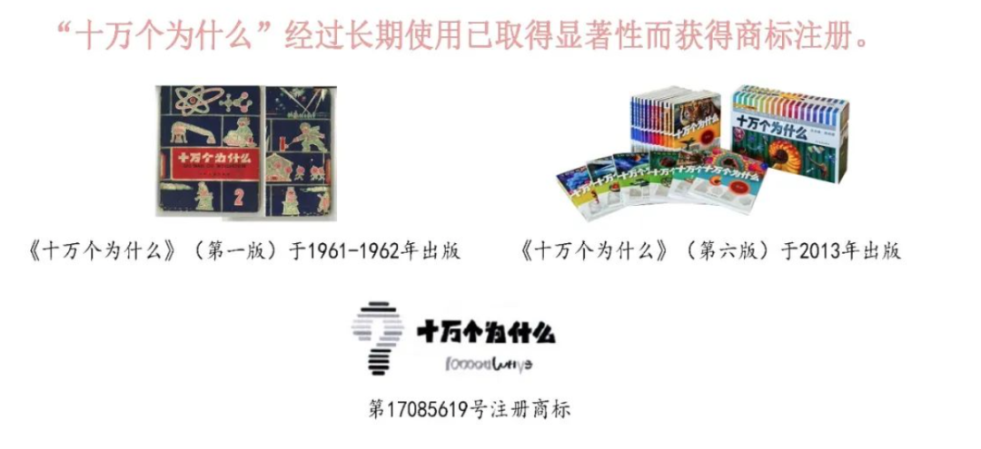 维权是基于《中华人民共和国反不正当竞争法》和《中华人民共和国商标法》,从“著作权”和“商标权”两个维度展开。著作权是知识产权的一部分,《十万个为什么》系列图书从1961年的第一版到2013年的第六版,十年一修订,这个过程已经形成了其独特的知识产权。在出版和出版服务的门类中,也分别注册对应商标的16类和41类。