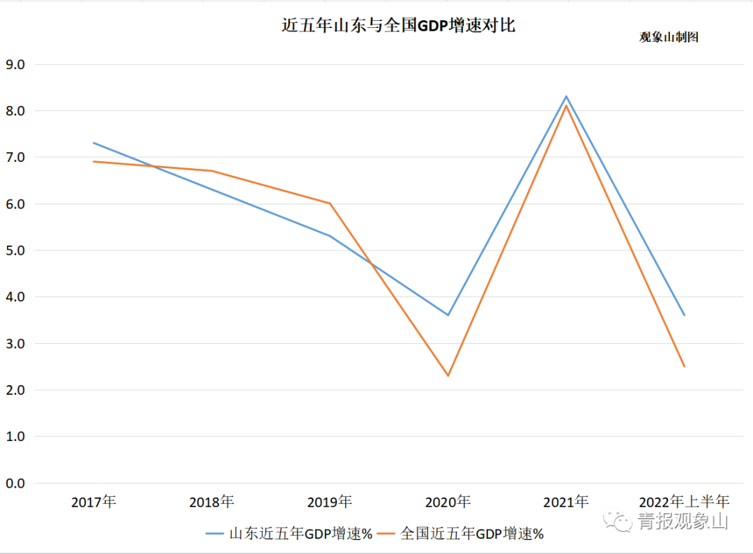 从2020年起,山东一举扭转了经济增速慢于全国的局面;经济总量占全国的比重也扭转了下降势头,呈现稳步上升趋势:2019年、2020年、2021年、2022年上半年,占比分别为7.15%、7.20%、7.27%、7.41%。