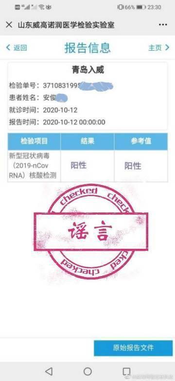 13日,微信群内传播一张山东某实验室出具的核酸检测报告,显示青岛入威人员安某某(身份证号码:3710831995xxxxxx15)核酸检测呈阳性。经查证,安某某核酸检测为阴性,该图片系付某某修改阴性为阳性后的伪造图片,案件正在进一步侦办中。