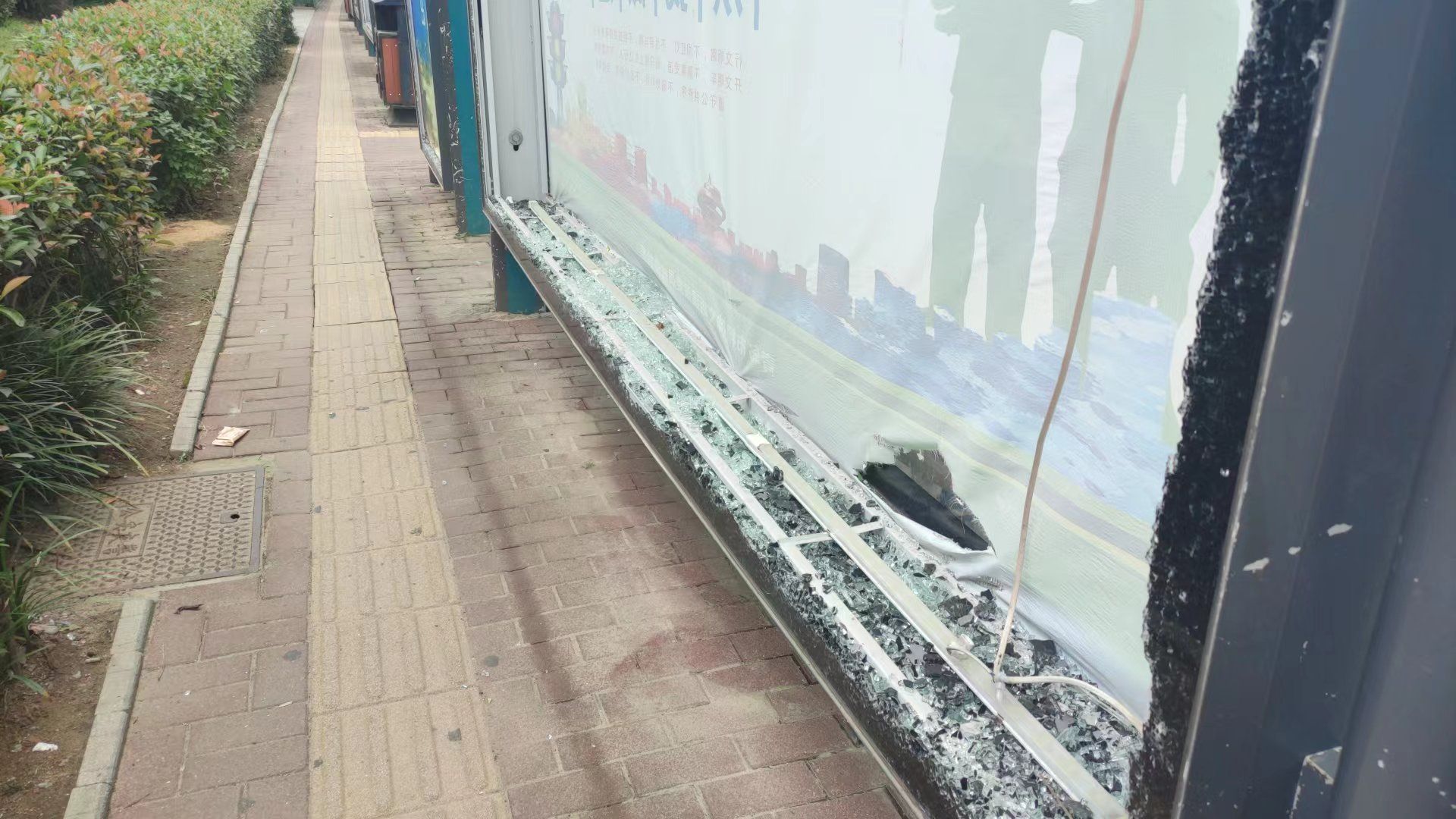 近日,记者在现场看到,网友反映的车站位于江山南路西侧,公交站背面有多个灯箱破碎,其中一块破损灯箱面积较大,灯箱内散落了很多玻璃碎片,电线裸露在外,广告画布“不翼而飞”。记者观察发现,灯箱边缘处的玻璃呈网状裂纹,参差不齐较为尖锐。