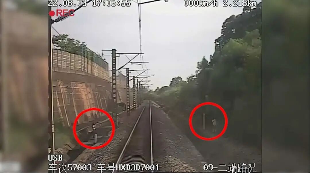 8月3日,57003次列车在钦港线钦州东普速场至海棠站间运行时,司机发现前方约300米处有2名女子在线路上拍照,立即采取紧急制动停车,鸣笛警示。