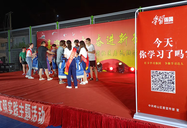 为了这场一年一度的社区纳凉晚会,社区文艺爱好者们早早排练节目,期待在社区纳凉晚会的舞台上展示靓丽风采。开场扇子舞拉开了晚会的序幕,拉丁舞、武术表演、古筝独奏、朗诵、歌曲独唱等表演,带给了居民不一样的视觉听觉感受。晚会增加了学习强国知识问答板块,并对石湾社区10名学习强国先进个人、1名好媳妇、1名好婆婆、2名好邻居现场表彰。