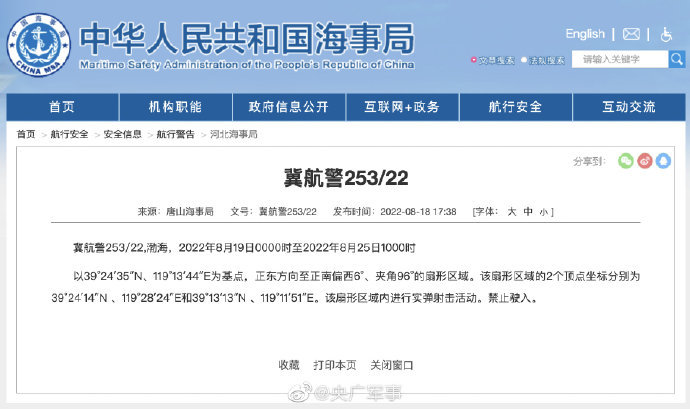 8月19日至25日,渤海部分海域将进行实弹射击活动 2022-08-18 20:29 @央广军事 0 唐山海事局发布航行警告,8月19日0时至8月25日10时,渤海部分海域进行实弹射击活动,禁止驶入。 责任编辑:郝媛媛