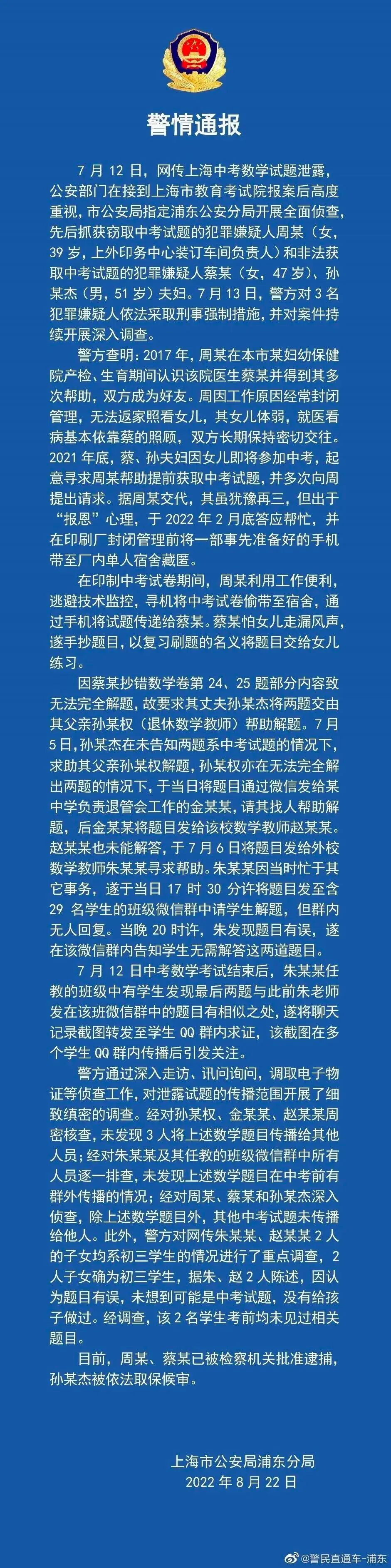 上海市公安局浦东分局8月22日发布的警情通报称:7月12日,网传上海中考数学试题泄露,公安部门在接到上海市教育考试院报案后高度重视,市公安局指定浦东公安分局开展全面侦查先后抓获窃取中考试题的犯罪嫌疑人周某(女,39 岁,上外印务中心装订车间负责人)和非法获取中考试题的犯罪嫌疑人蔡某(女,47岁)、孙某杰(男,51 岁)夫妇。7月13日,警方对3名犯罪嫌疑人依法采取刑事强制措施,并对案件持续开展深入调查。
