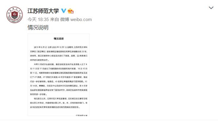 江苏师范大学科文学院:22例肺结核患者已休学,筛查又发现43名学生异常