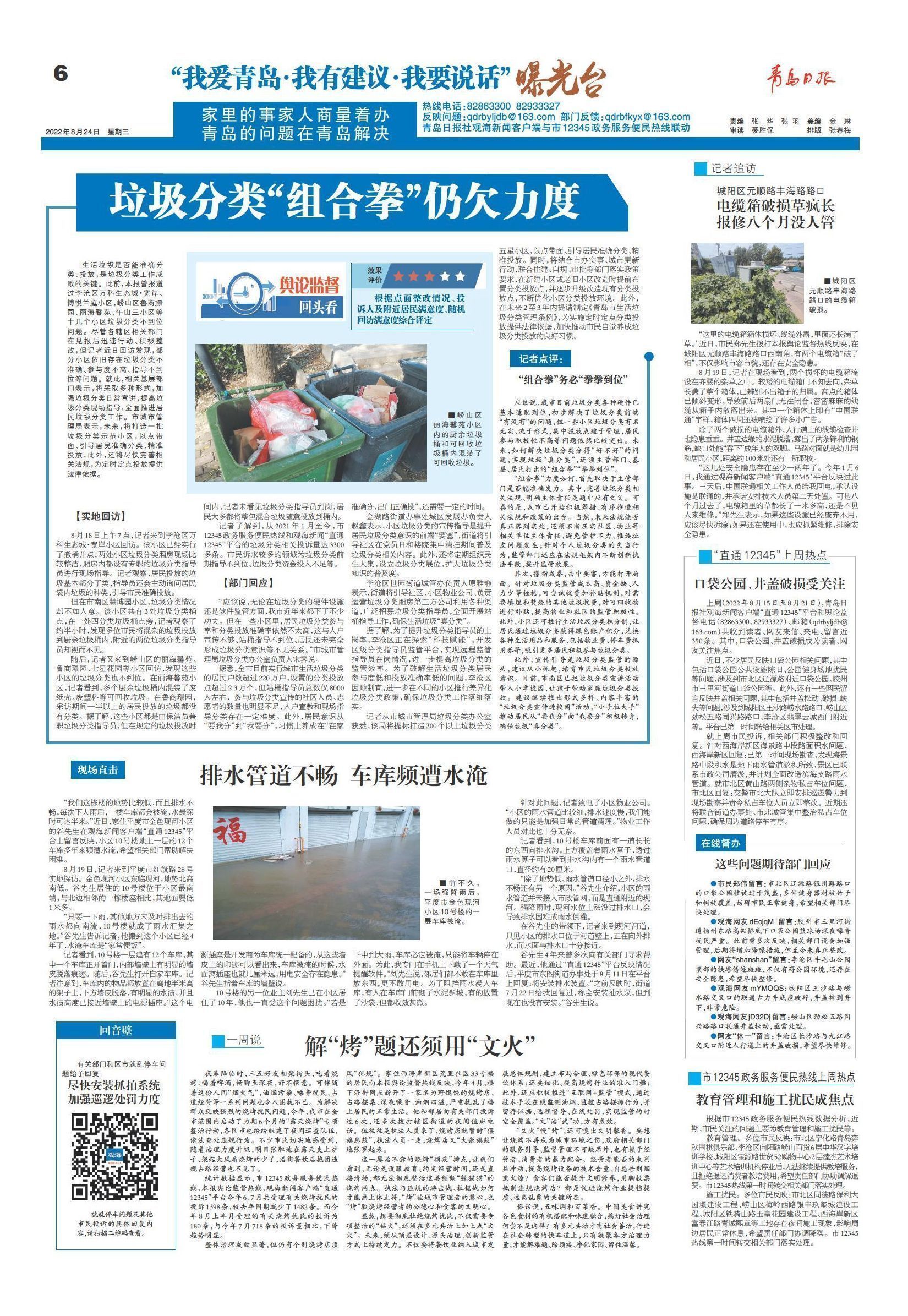 上周(2022年8月15日至8月21日),青岛日报社观海新闻客户端“直通12345”平台和舆论监督电话(82863300、82933327)、邮箱(qdrbyljdb@163.com)共收到读者、网友来信、来电、留言近350条。其中,口袋公园、井盖破损成为读者、网友关注焦点。