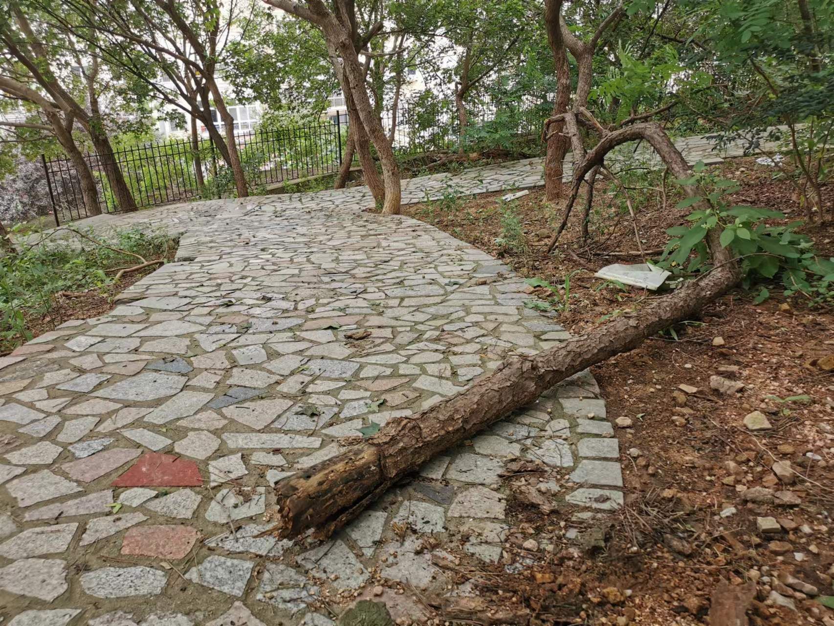 记者在萍乡路22号的中庭山景小区看到,小区内的广场东侧有一处山头绿地。沿石阶山路登山,走出不到5米,路边就有一棵倒伏的枯死树木。记者注意到,这棵直径约15厘米的枯树从根部折断,因枯死时间较长,树干部分已经腐朽,里面滋生了许多不知名小虫。记者沿山路探访发现,视线所及的山坡范围内就有10多棵枯死树木,有的路边枯树倒伏后,树枝挡住了部分道路。