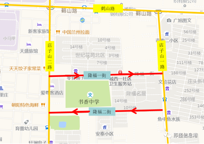 隆福一街、隆福二街于2022年9月1日实行机动车单向交通。隆福一街设置为机动车由店子山二路路口驶入,向东行驶,由店子山一路路口驶出,禁止机动车由店子山一路路口驶入,向西行驶;隆福二街设置为机动车由店子山一路路口驶入,向西行驶,由店子山二路路口驶出,禁止机动车由店子山二路路口驶入,向东行驶。(如图)