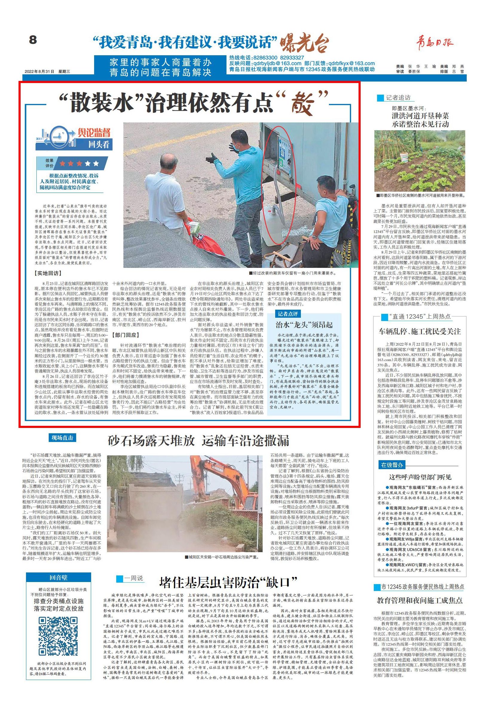 综合回访的情况记者发现,无论是对非法取水的源头治理,还是“散装水”的售卖叫停,整改效果喜忧参半,全链条治理依然缺乏统筹协调。据市12345政务服务便民热线和本报舆论监督热线近期数据显示,有关“散装水”的投诉依然不少,涉及市南区、市北区、崂山区、西海岸新区、胶州市、平度市、莱西市的20个地点。