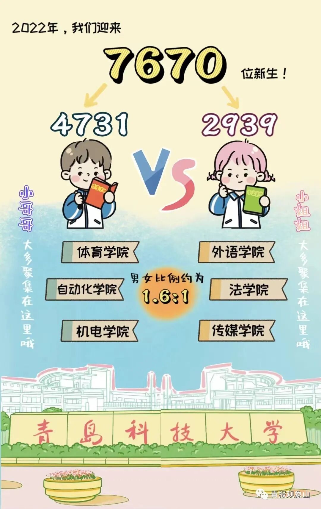 青岛科技大学共迎来7670位新生,其中5632位新生来自山东省内(占比73.4%),来自新疆(206位)和贵州(145位)的同学紧随其后。新生男女比例为1.6:1,其中“含男量”较高的学院为体育学院、自动化学院和机电学院,女生则大多聚集在外语学院、法学院和传媒学院。