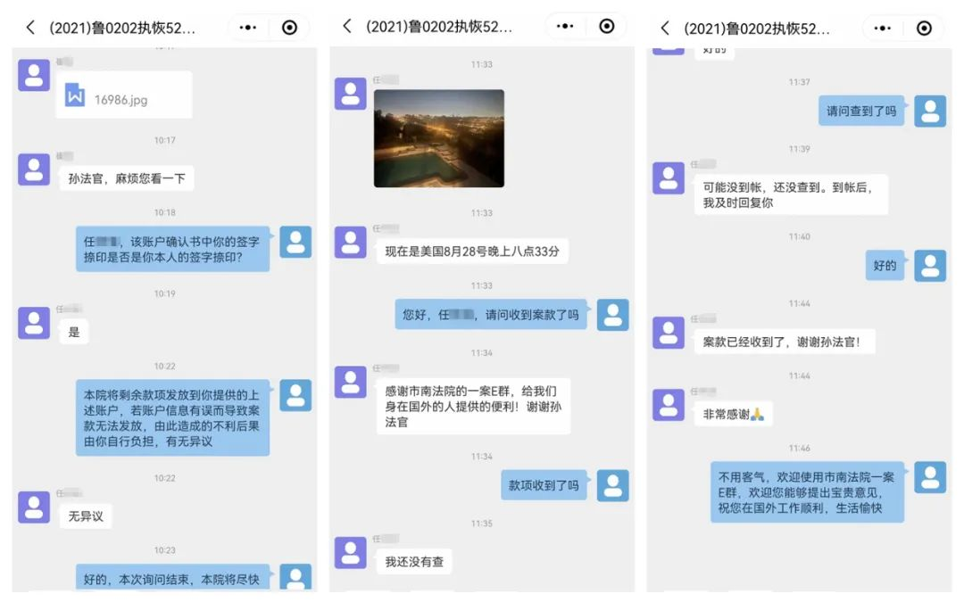 青岛日报社/观海新闻9月2日讯 “感谢市南法院一案E群,给我们身在国外的人提供了便利,谢谢孙法官!”一位远在美国的被执行人通过一案E群平台发来了消息,表达了对市南法院一案E群平台和孙兴文法官团队的感谢。这是市南法院一案E群平台在更广领域适用方面的新突破。