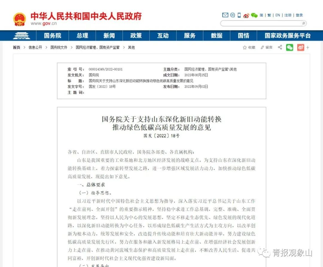 9月2日,国务院印发《关于支持山东深化新旧动能转换推动绿色低碳高质量发展的意见》(以下简称《意见》),支持山东在深化新旧动能转换基础上,着力探索转型发展之路,进一步增强区域发展活力动力,加快推动绿色低碳高质量发展。