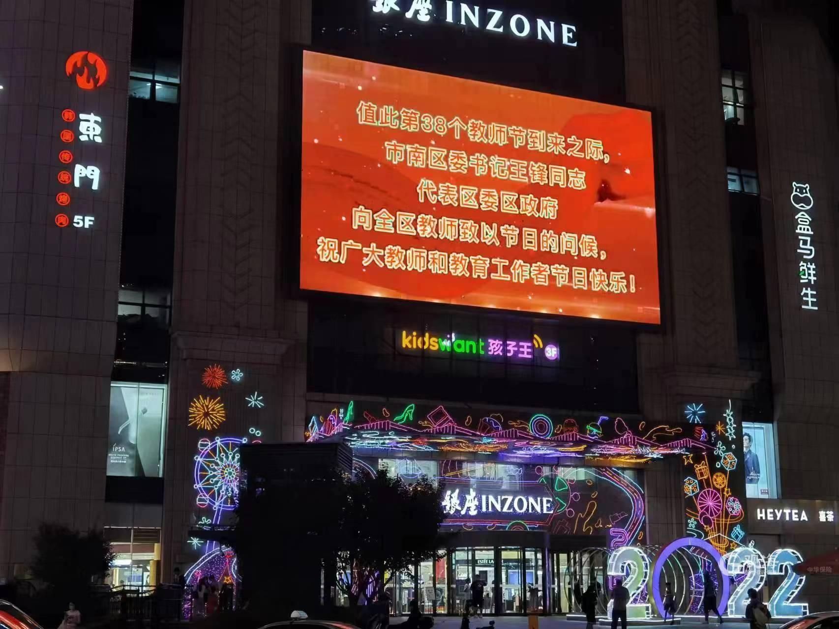 “没有最好,只有更好。为了学生一生的发展,我愿竭尽全力构建属于学生的快乐课堂”“严慈相济,助力学生成长、成人、成才”“用‘勤’鞭策自己,用‘爱’浇灌幼苗,用‘心’体验孩子”……最近几天,市南区远洋广场、家乐福、银座以及中山路百盛等楼宇室外LED大屏用最醒目、最温暖、最荣耀的红色背景滚动播出市南“名师榜”,彰显国家级、省级名师的个人风采和教育理念,吸引众多市民驻足观看。让沿海一线为教师“闪耀”,市南区以这种形式向教师致以最崇高的敬意。