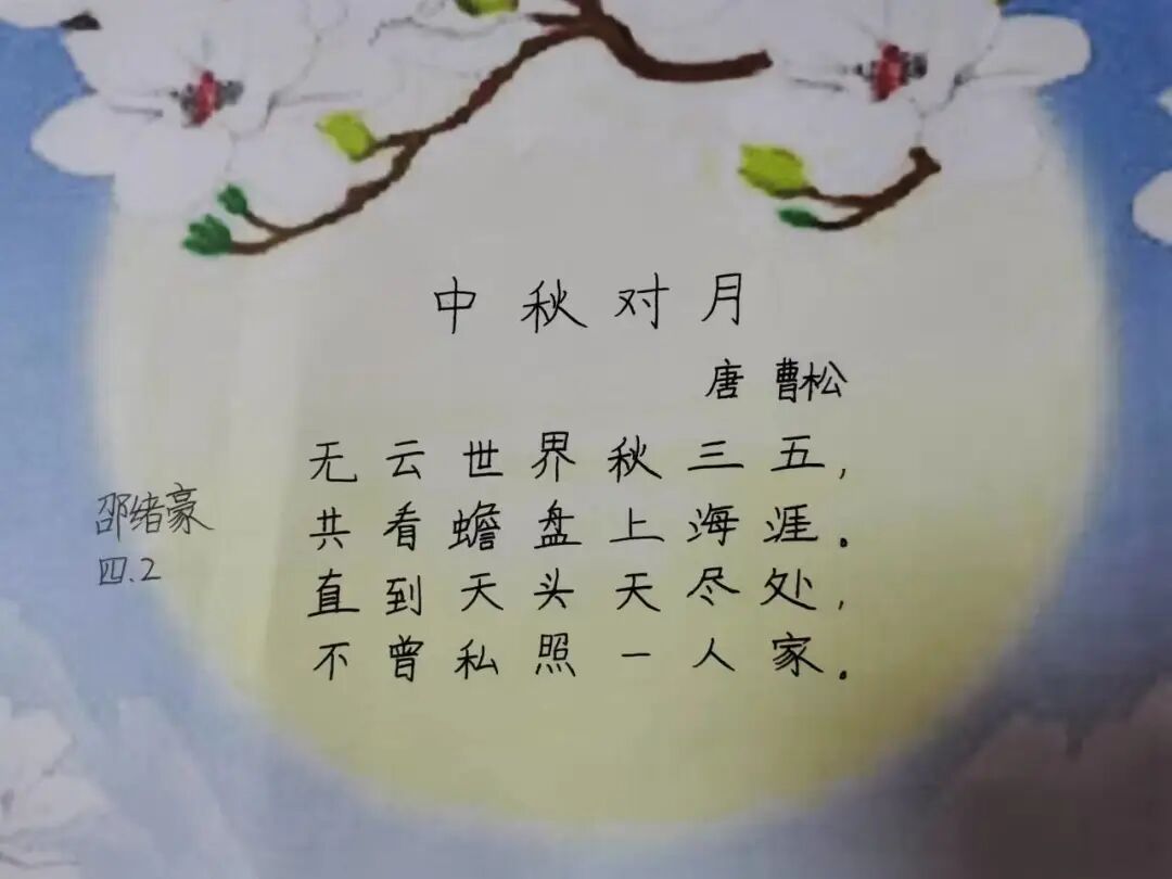 中秋节,抬头望月的时候,我们脑海中总会不由自主地浮现出许许多多美好的咏月佳句。点燃了孩子们心中吟诵中秋诗词的热情。低年级的豆豆们,你一言我一语,一首一首千古名篇脱口而出。