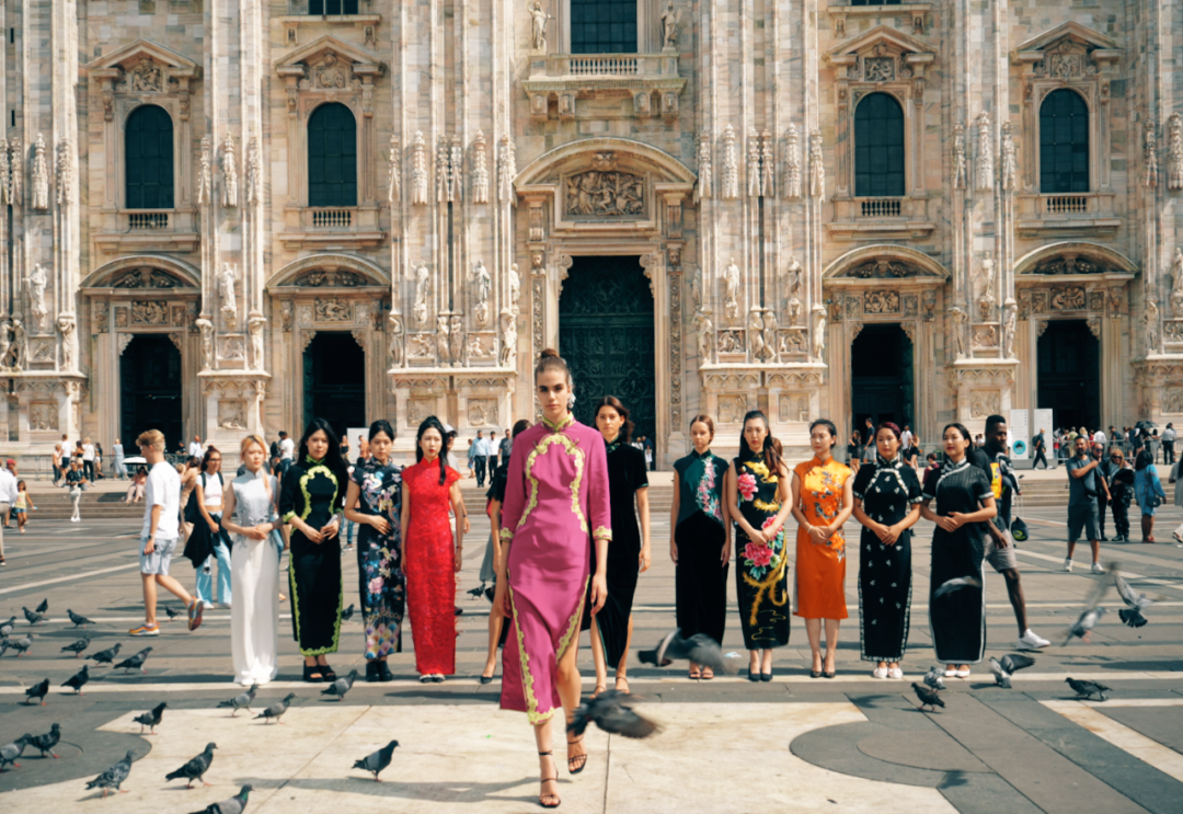 端庄典雅的非遗手绣长裙、仙气飘飘的二十四节气时令服、光泽亮丽的水生木旗袍……意大利米兰大教堂前中心广场上、米兰理工大学校园内,充满中国传统文化元素的服饰,在不同肤色的模特身上绽放出别样的华彩烂漫!
