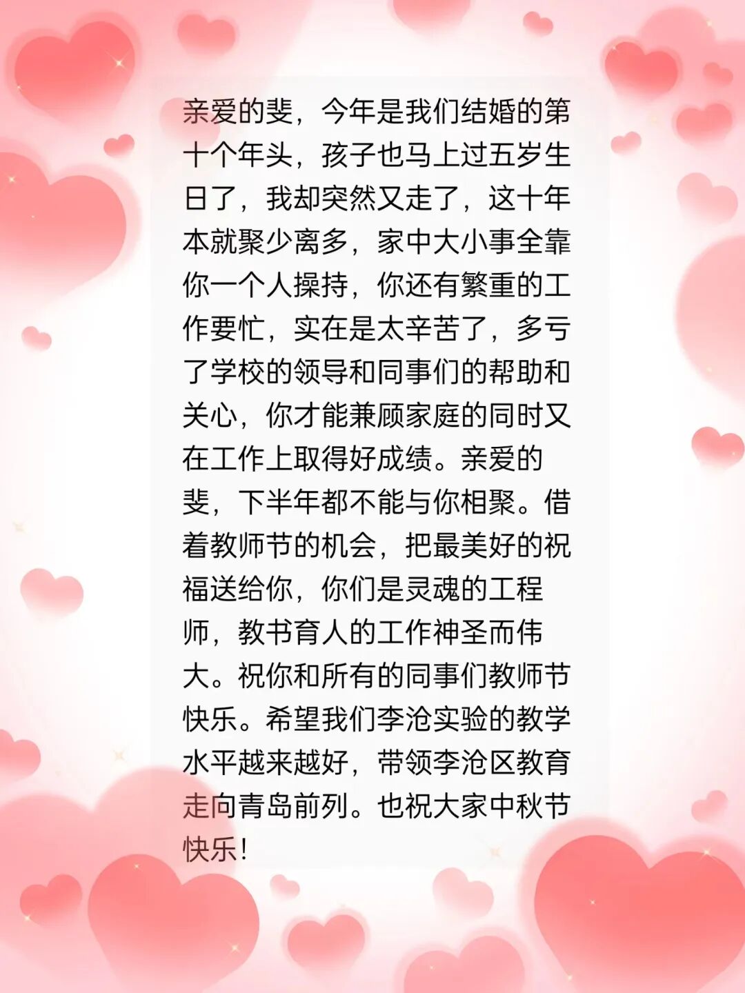 你在三尺讲台育栋梁,我一身戎装保家园。“你在我心里是最美” “感谢有你”,教师节当天,李沧区实验小学的部分教师收到了来自工作在外,无法回家与家人团聚的爱人的爱的表达↓↓↓